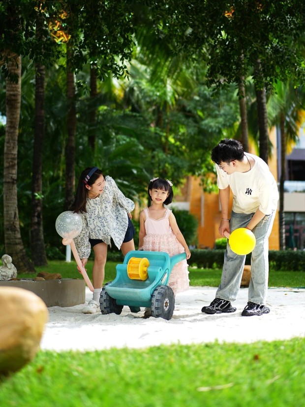 👧🏻 玩法:白色沙池藏在大榕树的树荫下,保护宝宝稚嫩的皮肤。挖沙工具陪伴孩子的笑声,而一旁的你享受难得的放松时刻!